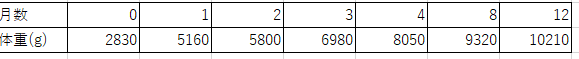 上記のような子供の出生時のデータがあった時、4カ月測定後、8カ月12カ月となっています。