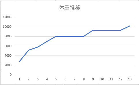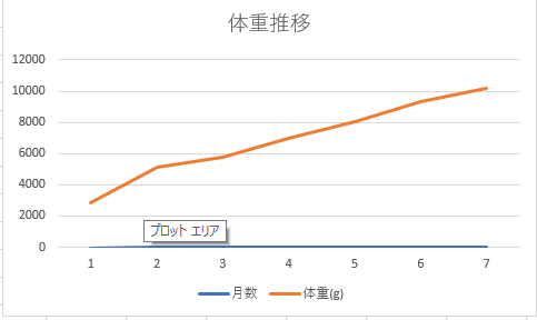 この表を表計算ソフトをグラフに起こす際、下のようなぐらふにしてしまうと、順調に体重が推移しているように見えてしまいますが、