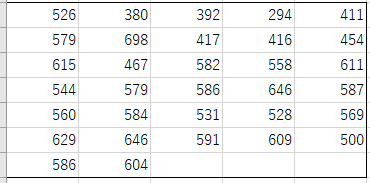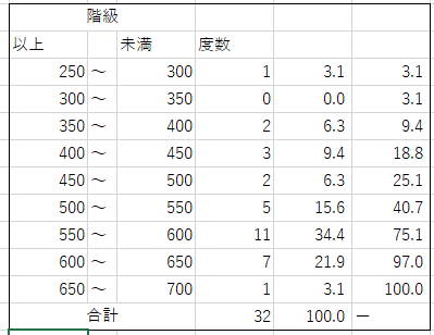 これを、250〜700の間で50kcalの幅でグループに分けたものが下の表になります。